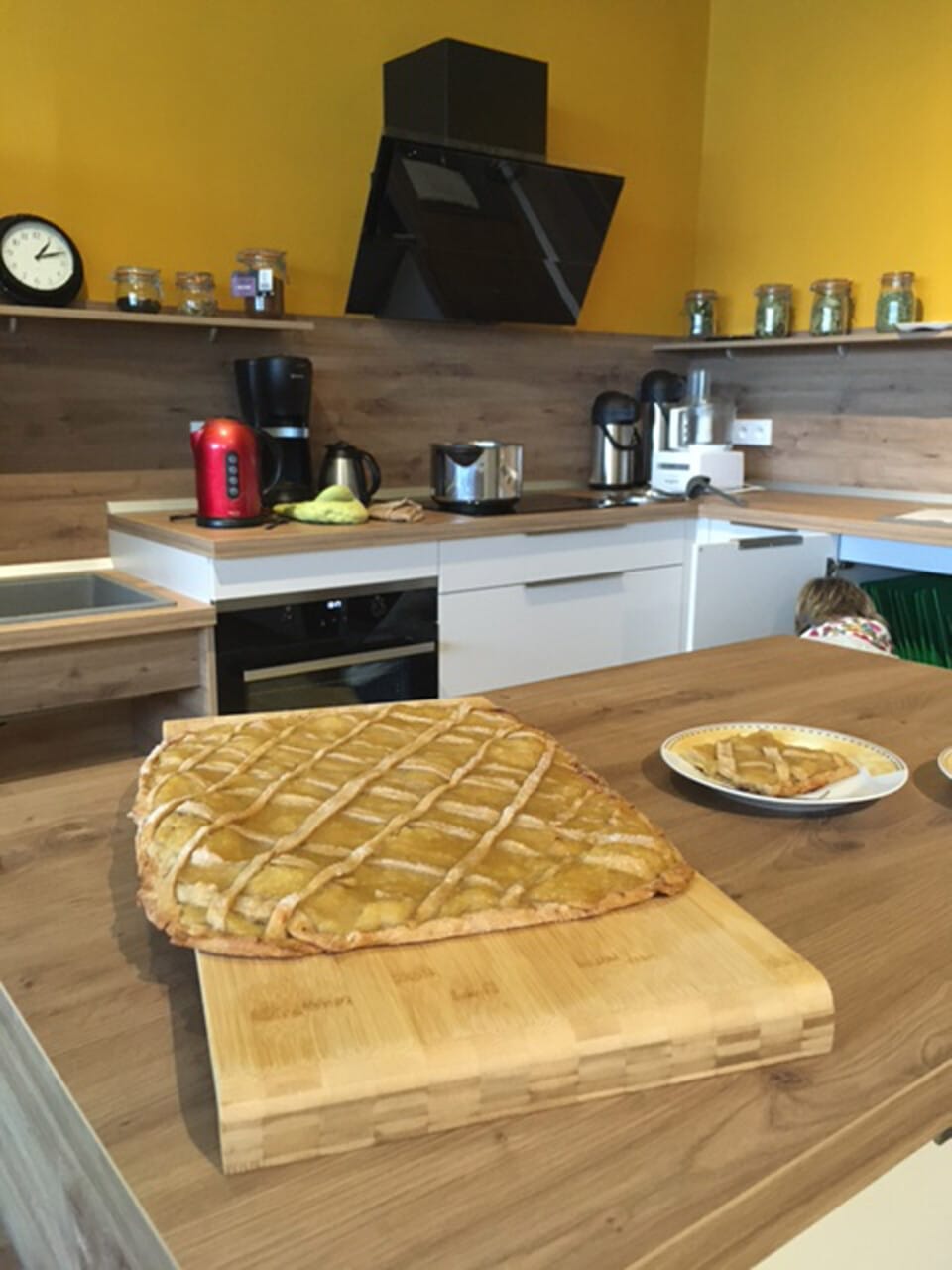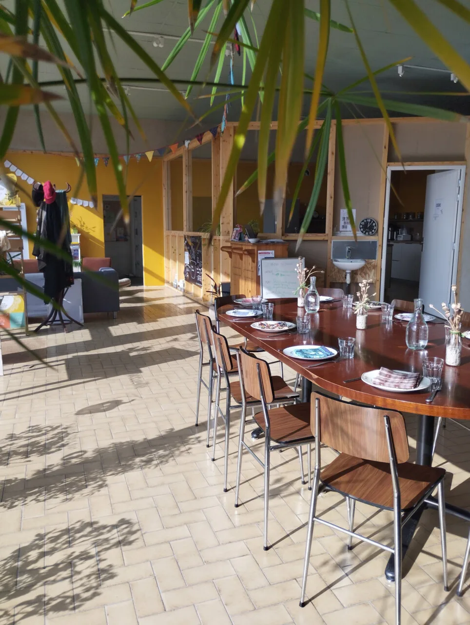 C’est un lieu de vie chaleureux et participatif où l’on peut venir cuisiner, déguster un repas gourmand sur de grandes tables partagées et participer à la vaisselle et au rangement.